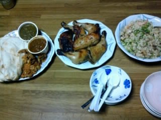 今日の夜ご飯はコストコで買ったチキンと台湾のチャーハンとナンをカレーにつけて食べました。